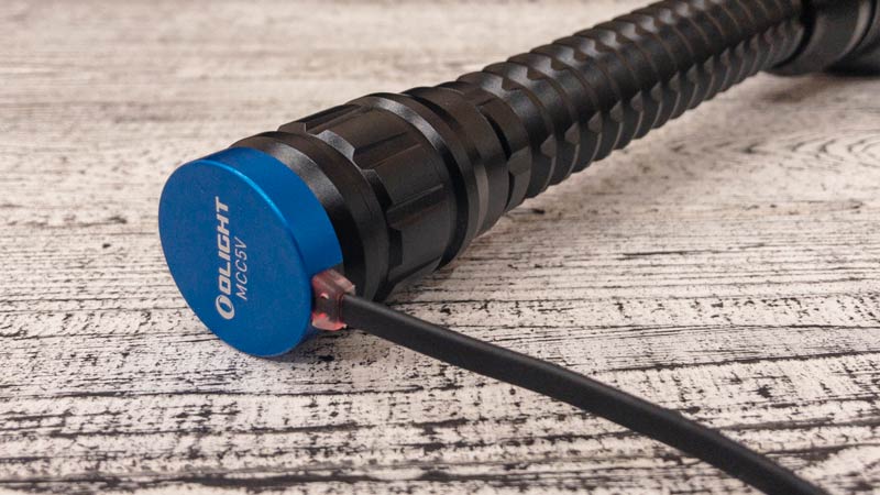 Зарядка Javelot PRO здійснюється за допомогою магнітного конектора, розміщеного в торцевій кнопці, що знайом власникам інших моделей Olight. Наявність неодимового магніту дає можливість не лише закріплювати ліхтар на більшості металевих поверхонь, а ще й використовувати нове покоління кнопок дистанційного управління. І якщо раніше вони накручувались замість оригінального тейлкпапу, то зараз усе набагато гуманніше. Необхідно лише під’єднати магнітний конектор до кнопки — так само, як і зарядний пристрій. При динамічній стрільбі з гладкоствольної напівавтоматичної рушниці кріплення з ліхтаря не злетіло, а тому можна бути певним, що цього не станеться і на менших калібрах.