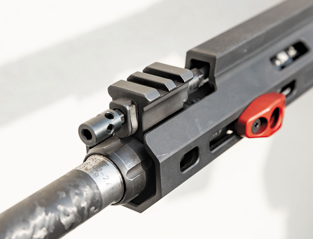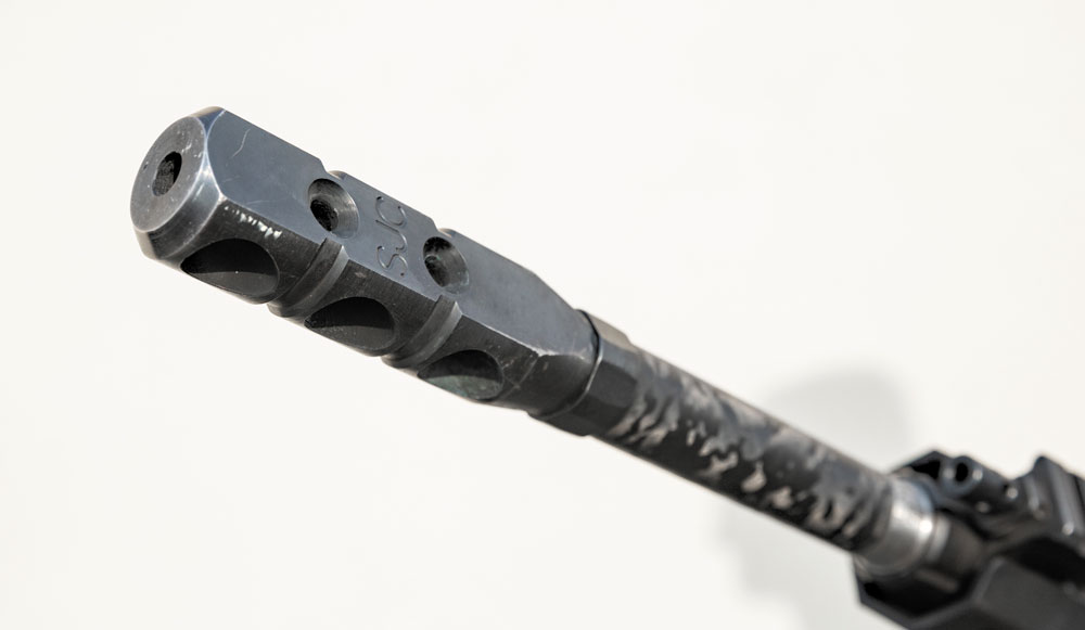 Шаг нарезов (твист) ствола выбран оптимальным — 1:8”, что обеспечивает стабилизацию широкого спектра пуль массой от 55 до 77 гран (я лично предпочитаю использовать патроны с пулями массой 62 и 69 гран). В дульной части ствола нарезана резьба, на которой установлен фирменный двухкамерный ДТК с возможностью настройки под выбранный боеприпас.